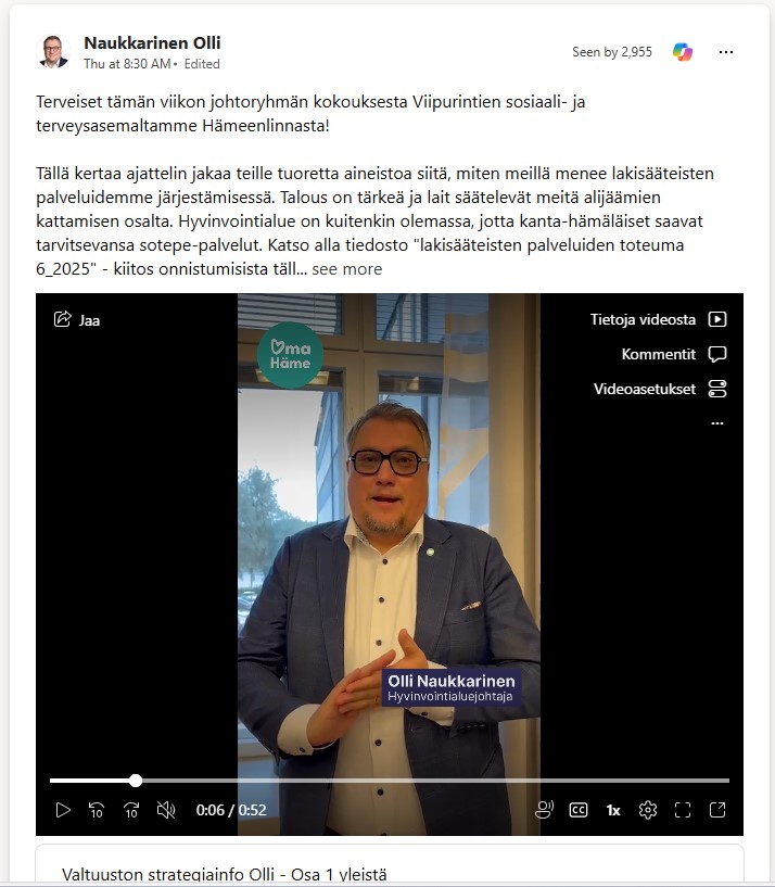 Päätettiin ottaa käyttöön matalan kynnyksen ratkaisu: hyvinvointialueella jo mm. intran kautta käytössä olevaan sisäiseen vuorovaikutukselliseen alustaan, Viva Engageen, perustettiin "johtoryhmän matkassa" -kanava, jossa hyvinvointialuejohtaja ja muu johtoryhmä julkaisee säännöllisesti matalalla kynnyksellä ajankohtaisia videoita ja lyhyitä postauksia kuvien kera mm. johdon arjesta, yksikkövierailuista, hyvinvointialueen ajankohtaisista asioista ja niiden taustoista sekä teemoista, joiden arvellaan herättävän kiinnostusta ja keskustelua henkilöstön keskuudessa. Kanavalle laadittiin sisältösuunnitelma ja hyvinvointialuejohtajan kanssa toteutettiin mm. johtoryhmän kokousten jälkeen videoita, joissa hän ja muu johto kertovat johtoryhmässä käsitellyistä aiheista. Hyvinvointialuejohtaja kuvaa myös itse kevyitä videoita esim. ministeriövierailuilta ja tapahtumista tai avaa tärkeiden asioiden taustoja ja vaikutuksia hyvinvointialueella. Videot ja julkaisut tehdään täysin omin voimin ja mahdollisimman kevyesti - viestinnän omaa työtä ja esim. videoiden editointia tarvitaan hyvin vähän.